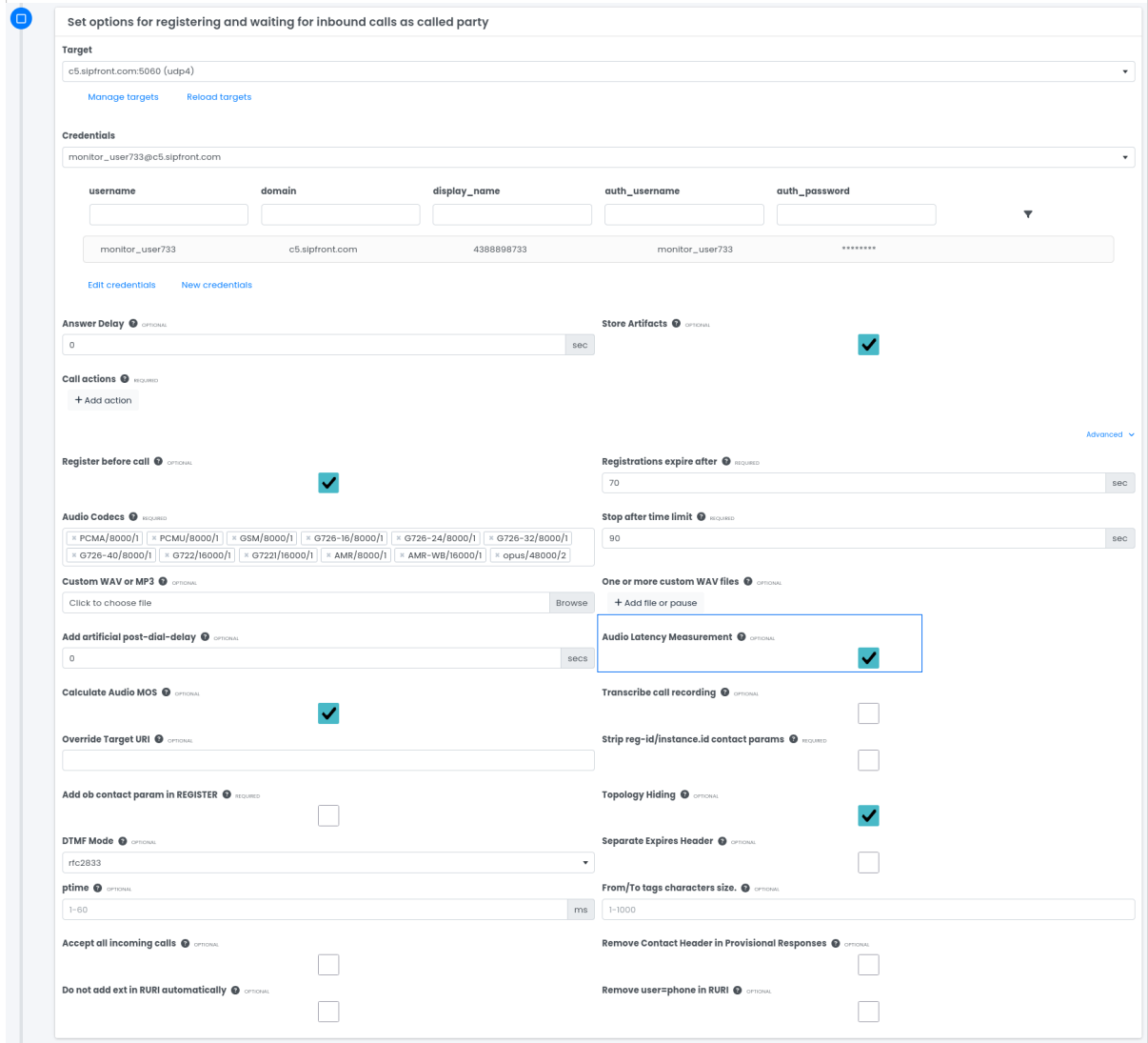 For AB tests such as Media Analysis for Audio Call, you may want to check how long it takes to send or receive an audio packet. With this condition enabled, you can measure this. To activate this feature, open your test config and go to the section Set options for registering and waiting for inbound calls as called party, then click on Advanced.